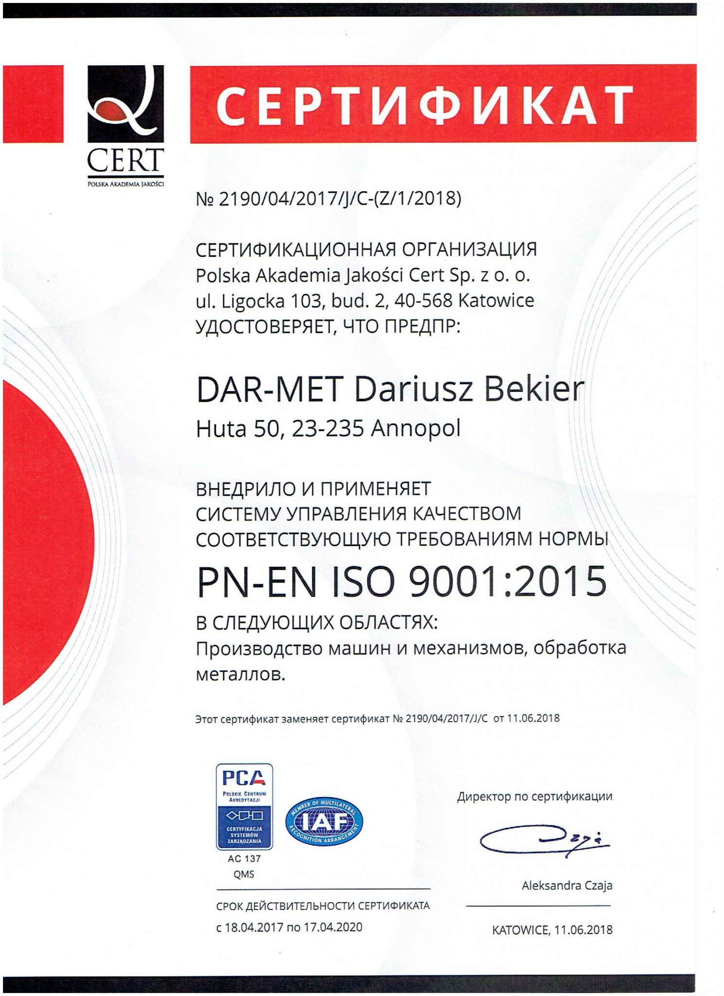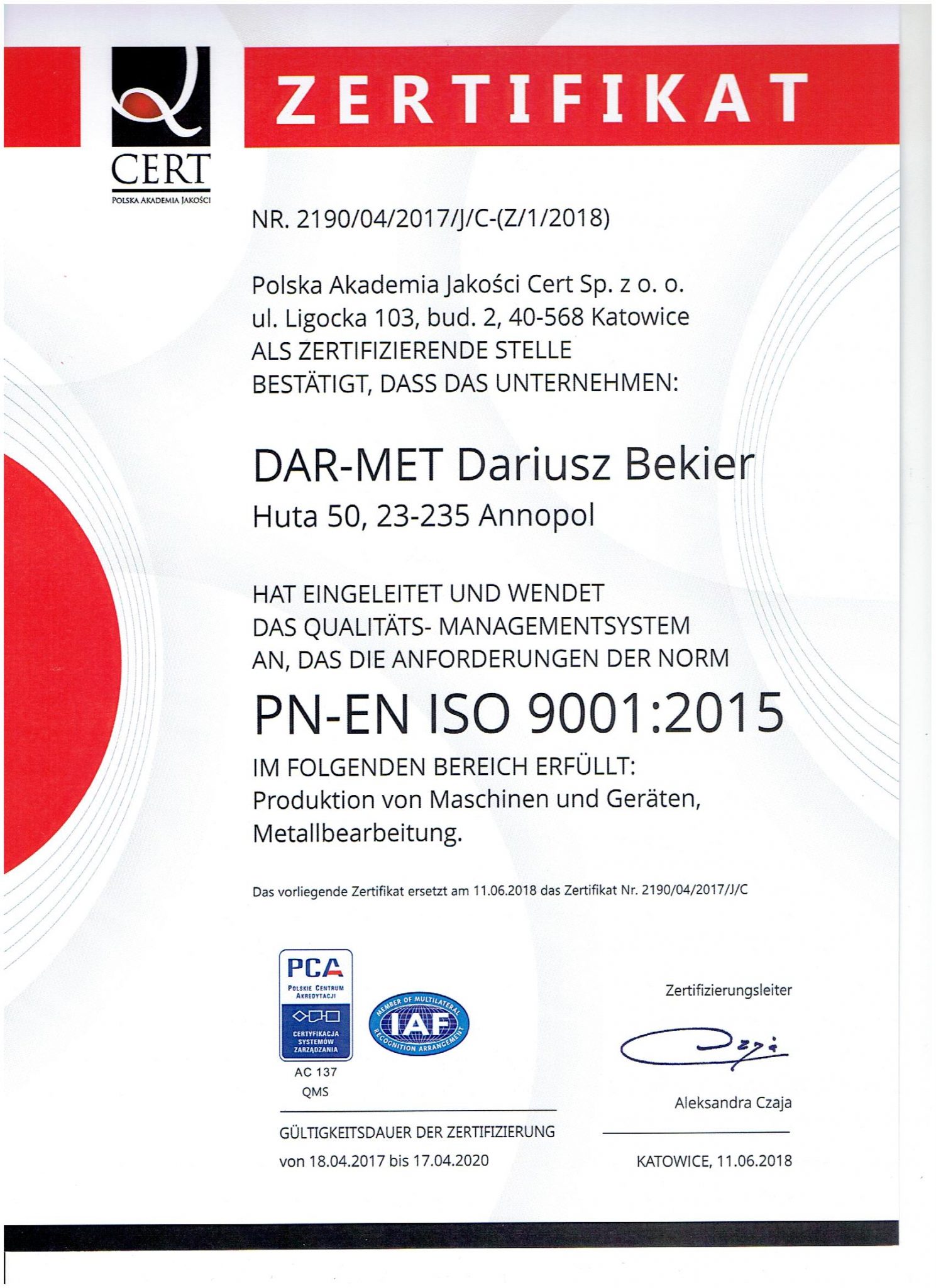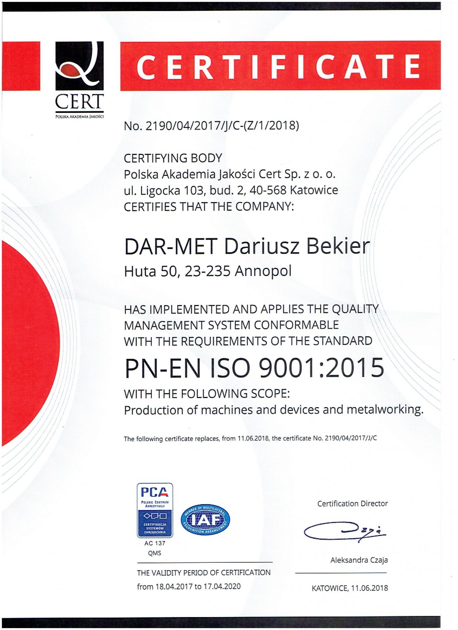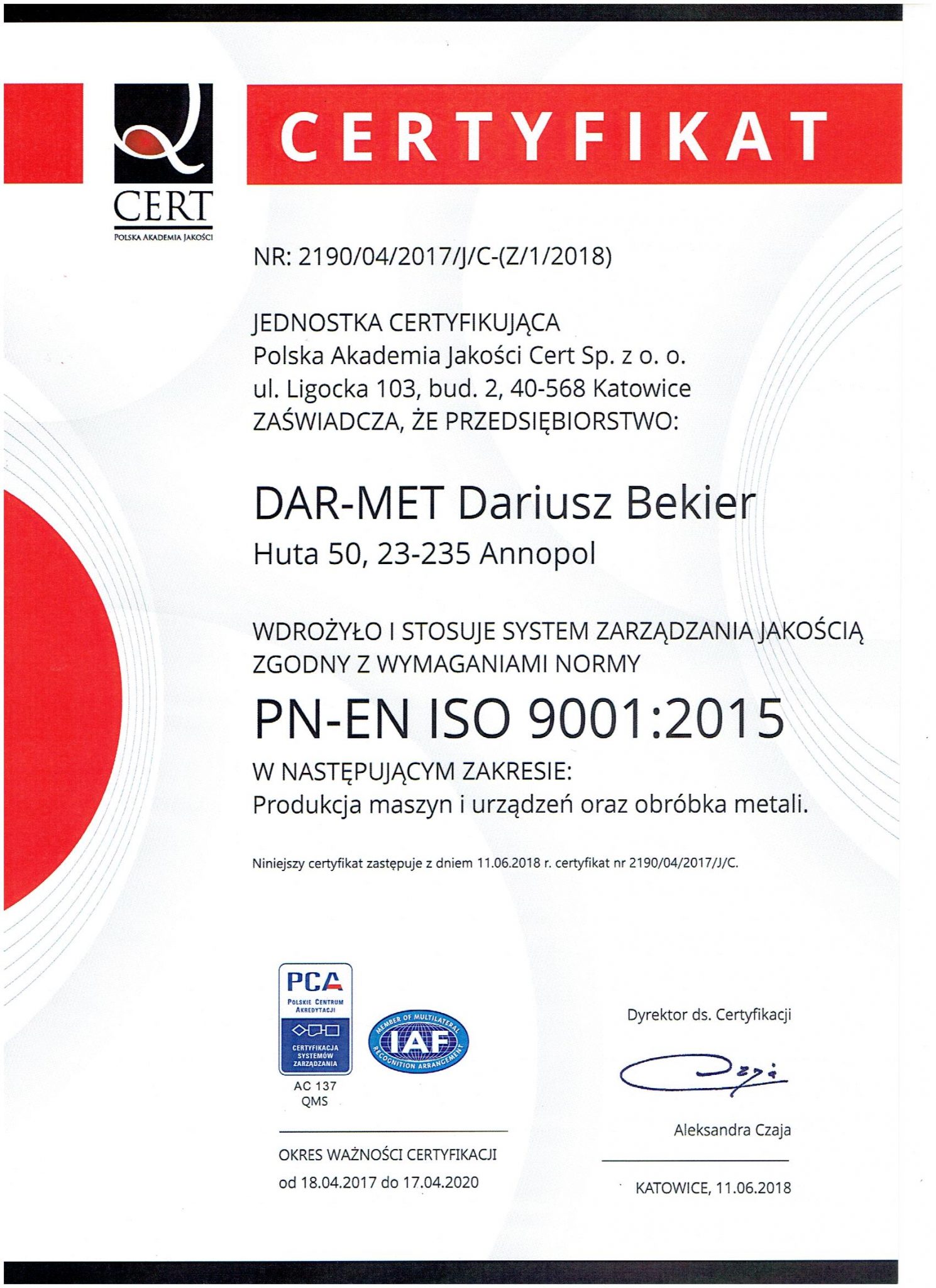 Informujemy, że nasza firma wdrożyła i stosuje system zarządzania jakością zgodny z wymaganiami normy PN-EN ISO 9001:2015 w zakresie: produkcja maszyn i urządzeń oraz obróbka metali.